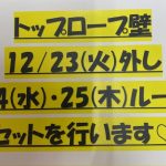 2025-12-19 / 最終更新日 : 2025-12-19 babatakehisa News & Events 12/23トップロープ壁外して24.25でルートセットします! こんにちは(^^)/ 12/23(火)トップロープ壁のホールドを外します。24(水)と25(木)でセットしますのでこの3日間はトップロープ壁使用不可です。 12/21(日)はクリスマスイベントの為13:00~17:00ま […]