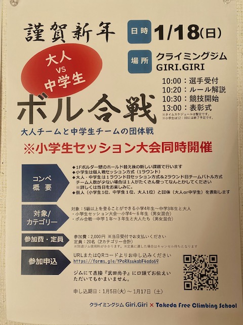 1/18(日)10:00~13:00まで1階ボルダーでコンペを行います。