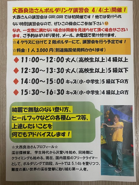 4/4(土)大西良治さんのボルダリング講習会開催します!