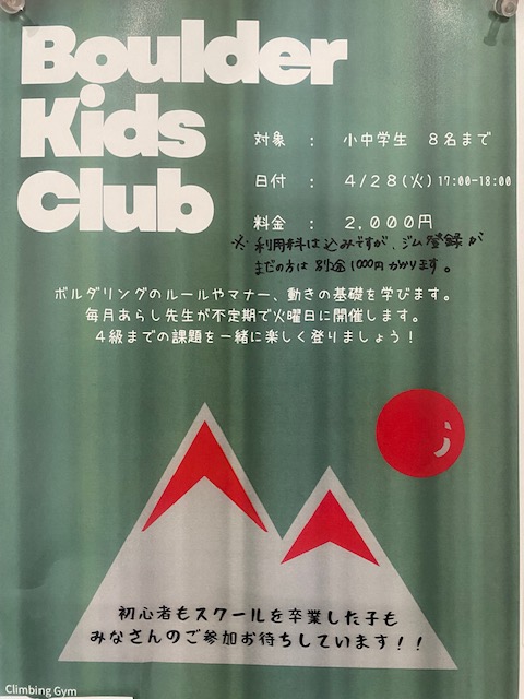 ボルダーキッズクラブ開講!4/28(火)17:00~18:00
