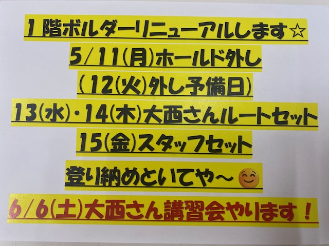 1階ボルダーリニューアルします! 5/11(月)・12(火)ホールド外し、13(水)・14(木)大西さんルートセット、15(金)スタッフセットです。登り納めといてください!!