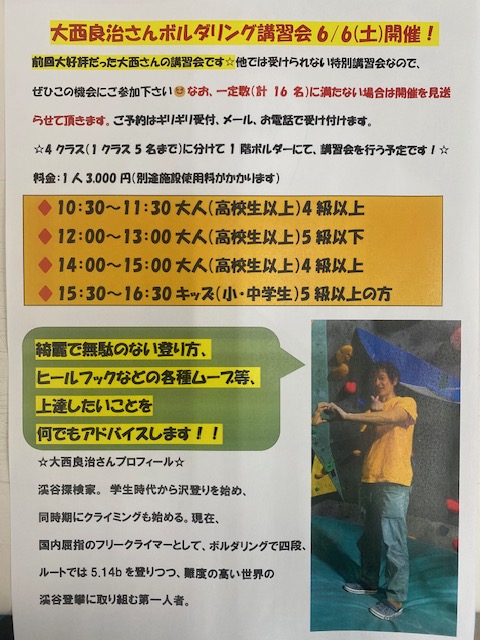 ♦大西良治さんボルダリング講習会6/6(土)開催♦